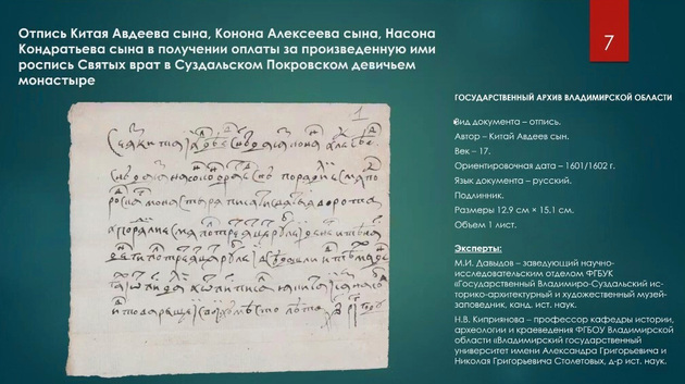 К примеру, один из таких документов, признанный уникальным, - отпись Китая Авдеева сына, Конона Алексеева сына, Насона Кондратьева сына в получении оплаты за произведенную ими роспись Святых врат в Суздальском Покровском девичьем монастыре. Подлинник датирован ориентировочно 1601/1602 годом.