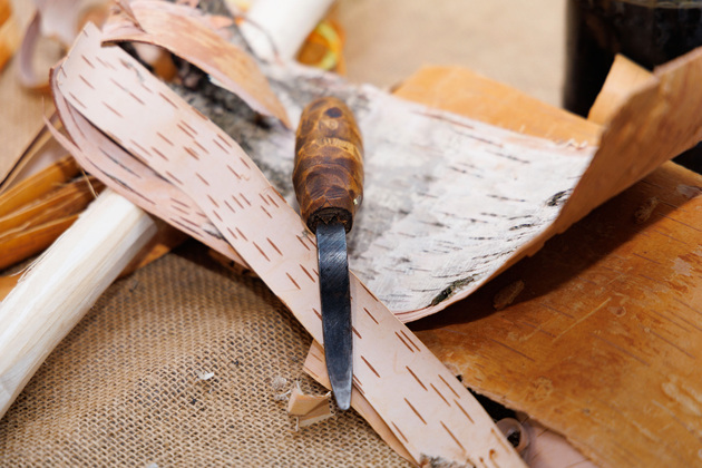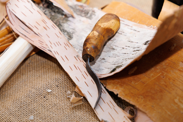 Правда, у бересты есть региональные особенности. Во Владимирской области на березах много сучков. А любой сучок для мастера означает ломкость и другие проблемы. Самая хорошая береста в Псковской, Костромской областях и части Ярославской, куда обычно ездим на заготовки. Я беру бересту не ниже 2 метров от земли. Берестянщик всегда делает сначала небольшой надрез и смотрит толщину бересты, проверяет на тягучесть, на ломкость. Если подходит, осторожно срезаем больше, сантиметров на 40. Делаем это обычно по весне, когда сокодвижение практически заканчивается.