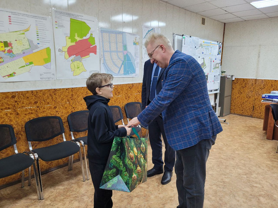 Вице-спикер Вячеслав Картухин вручил новогодний подарок Ивану из города Камешково - современный спальный мешок.