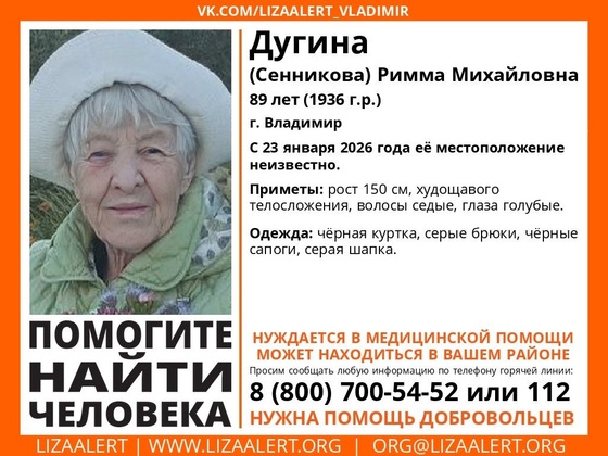 Во Владимире объявлен сбор волонтеров поискового отряда «Лиза Алерт» для поисков пропавшей 89-летней пенсионерки. В условиях экстремального похолодания жизнь пожилой женщины находится под серьёзной угрозой.