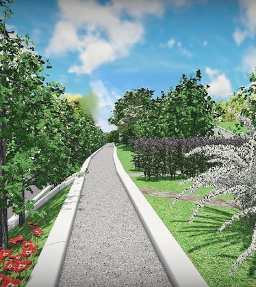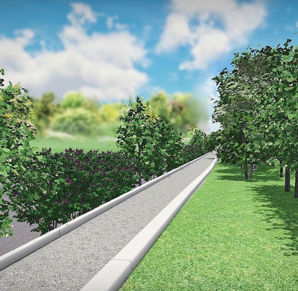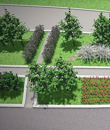 Здесь появятся липы, клены и декоративные яблони. Яркости локации придадут кусты сирени и посконника, а обрамление будет выполнено из спиреи и дёрена.