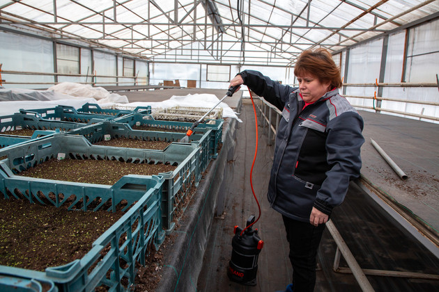 - А полив мы проводим вручную, - поясняет Мария Шашкова. - Заливаем теплую воду в бак, качаем помпу, и влага через распылитель поступает в грунт. В это время года поливаем растения раз в неделю, а весной и летом, когда жарко, делаем это три раза в день. Так растения получают всё необходимое для развития.
