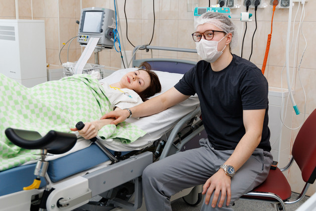 А в другой палате уже вовсю намечаются партнерские роды. Рядом с женой Дианой у кровати сидит муж Даниил. Он рассказывает, что это будет их второй ребенок. И оба родителя очень благодарны перинатальному центру.
