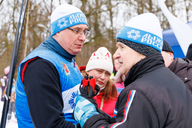 «Всех рад приветствовать здесь на 44-й Лыжне России. В прошлом году зима была тёплая, но в этом году она щедрая на мороз. Всех поздравляю с праздником спорта! Спасибо нашим ветеранам спорта, которые, несмотря на возраст и морозы, всегда занимаются спортом. Два года назад это было более 10 тысяч. Надеюсь, в этом году благодаря снежной зиме, мы этот рекорд побьём. Поэтому занимайтесь спортом, становитесь на лыжи, бегайте, по утрам делайте физкультуру, будьте в хорошей форме и берегите своё здоровье. Владимир, с праздником!»