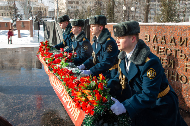 По традиции курсанты из Парадного расчета ВЮИ ФСИН России вначале церемониальным шагом возложили памятную гирлянду, на которой было начертано: «Вечная память павшим героям».