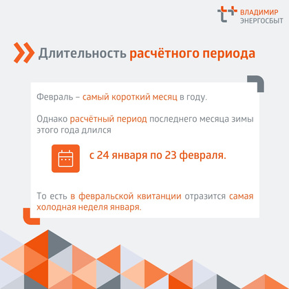 Вторая причина – период, который берётся для расчётов суммы в квитанциях. Плата за коммунальную услугу начисляется не за календарный месяц, а за период между снятиями показаний. Для февральской квитанции - с 24 января по 23 февраля. Таким образом, в платёжку попала и самая холодная неделя зимы в конце января.