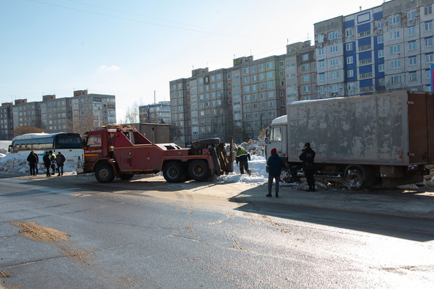 Представители горадминистрации рассказали, что нашли в городе только две фирмы, которые имеют технику для эвакуации большегрузов. По иронии судьбы по дороге к ул. Василисина эвакуатор, арендованный мэрией, сломался. Но в итоге всё же прибыл. А дальше было еще сложнее. Подцепленный тросом «МАЗ» и не собирался двигаться с места. Присутствовавшие стали делать ставки кто кого сдвинет. Не с первой попытки, но «МАЗ» всё же сдался на милость эвакуатора…
