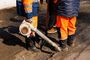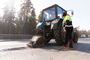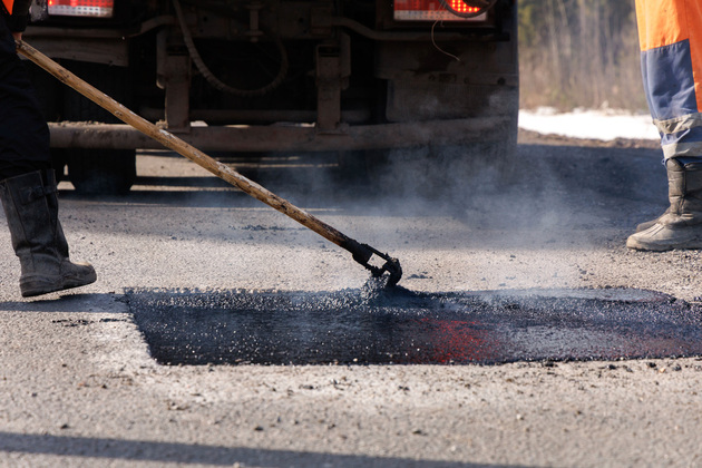 Фрезой, подвешенной к трактору, рабочие выравнивают края каждой выбоины. Затем сформированный прямоугольник тщательно вычищают и заполняют из специальной машины до краев литой асфальтобетонной смесью.