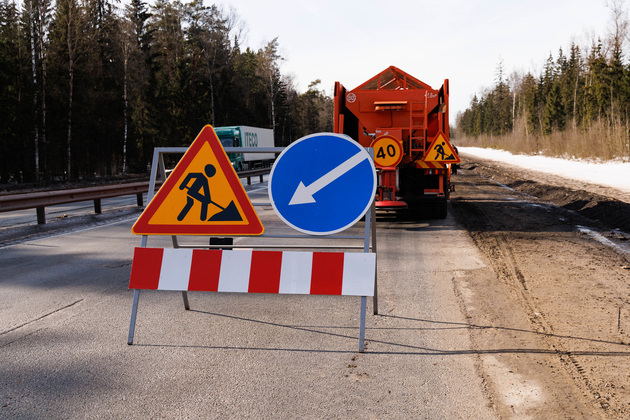 Дорожники работают на одной их двух полос, движение по которой на этом отрезке временно перекрыто. Но в этот час трафик не такой плотный, и машины проносятся мимо работающей бригады дорожников по второй полосе без всякой пробки.
