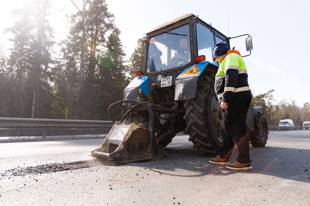 Мы смогли увидеть вблизи, как бригада АО «ДСУ-3» выполняет обязанности подрядчика на этом участке федеральной дороги и исправляет дефекты при выходе из зимы.