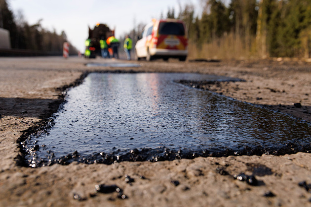Уже через полчаса каждая из асфальтобетонных «заплаток» на поврежденном дорожном полотне затвердеет так, что по ней можно ездить.