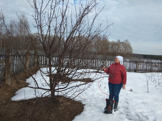 В средней полосе первое опрыскивание сада проводят ориентировочно во второй половине марта - начале апреля, когда начинают набухать почки на кустарниках и деревьях, по ночам устанавливается слабоположительная температура, а днем столбик термометра не опускается ниже 5°С. Ничего страшного, если местами на участке будет лежать снег и почва не оттает полностью. Важно успеть провести обработку до распускания почек.