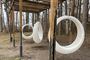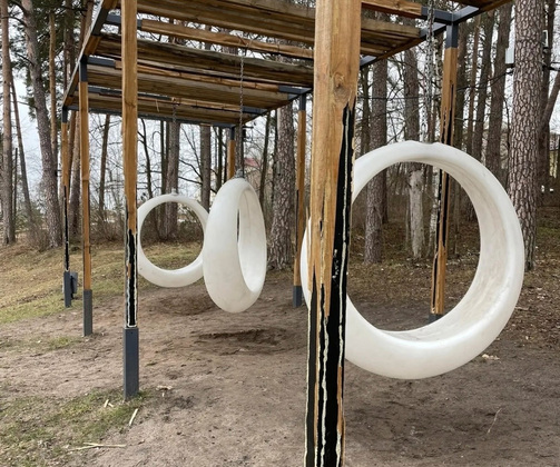 Активная зона в парке оборудована спортивными тренажерами, качелями и лавочками для отдыха.