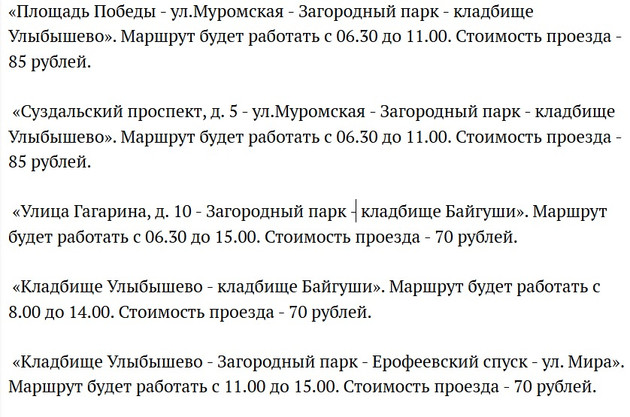 Для жителей Владимира администрация города организует на Пасху, 12 апреля, специальные автобусные маршруты до кладбищ Байгуши и Улыбышево. Предусмотрен бесплатный проезд для льготных категорий граждан.