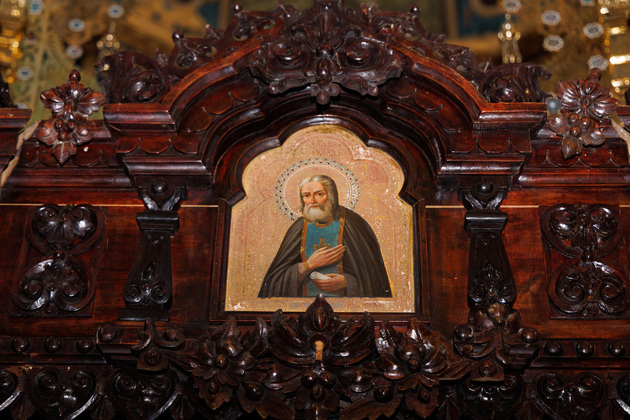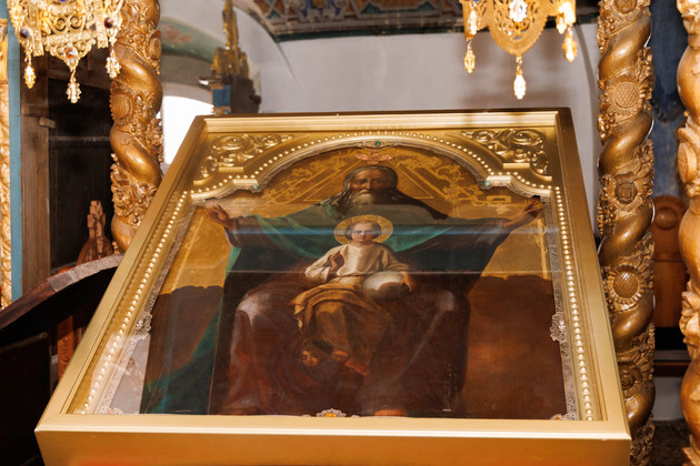 Матушка Иоанна показала две отреставрированные иконы. Одна из них называется «Отечество» и была написана в конце XVIII века. На ней изображены Бог Отец, Господь Саваоф (Господь Воинств или Вседержитель) и младенец Иисус Христос. Икону после научной реставрации передали обители в октябре прошлого года.