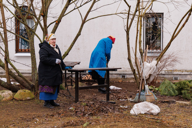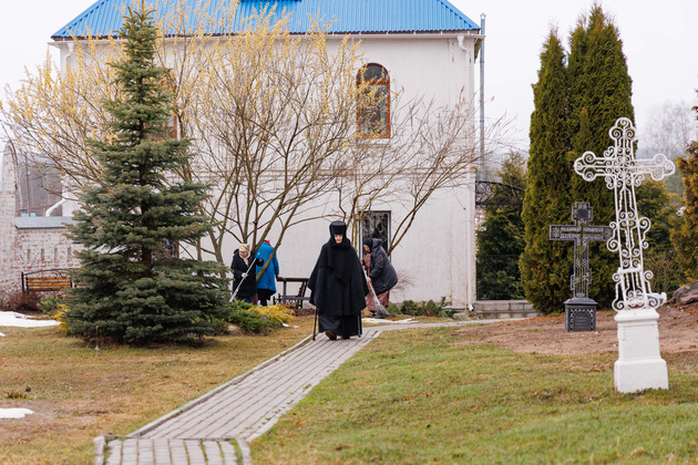 В момент нашего приезда послушницы очищали территорию монастыря от прошлогодней листвы. Перед Страстной седмицей необходимо всё привести в порядок, чтобы в последние дни перед Пасхой полностью посвятить себя молитвам. Это время самого строгого поста, когда сестры сопереживают крестному пути Спасителя и стараются освободить сердце от суеты и грехов через покаяние.