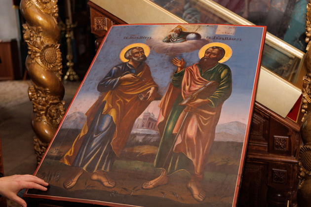 Второй восстановленный образ - икона святых апостолов Петра и Павла. Реликвия долгое время находилась в запасниках Владимирской епархии и была скрыта от глаз прихожан. После реставрации она наконец-то заняла свое законное место.