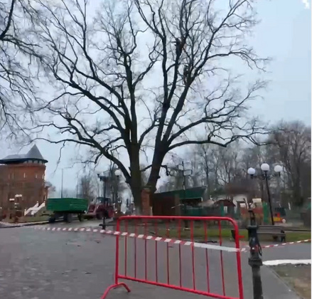 Сегодня специалисты провели санитарную обрезку кроны черешчатого дуба. Это необходимо, чтобы спасти великолепный дуб, возраст которого более 110 лет. Дело в том, что в 2011 году на нем была установлена специальная система стяжек и пломба, чтобы его ствол не разрушался. Однако за прошедшие годы дуб значительно прибавил в объемах, и металлическая цепь, скреплявшая ствол, лопнула.
