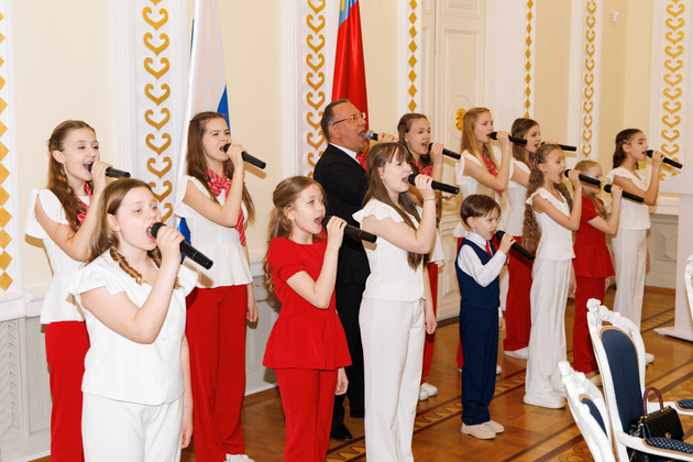 Детские голоса зазвучали с самого начала торжества. Вместе с ведущим церемонии Сергеем Артемьевым дети из театра песни «Калейдоскоп» исполнили гимн России.